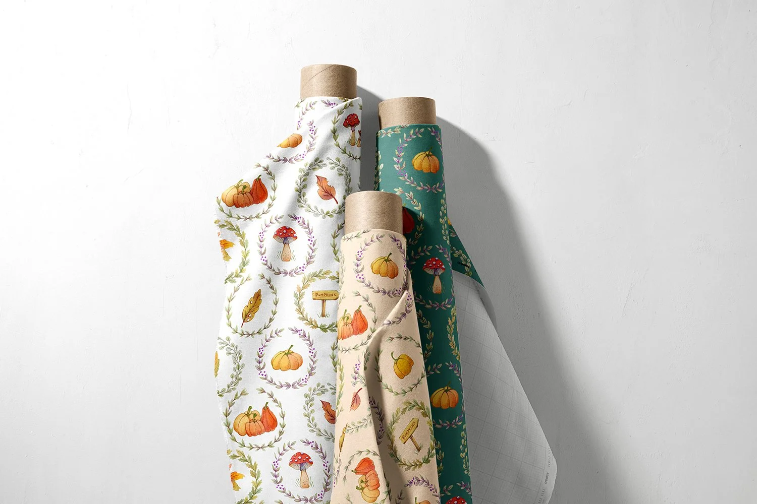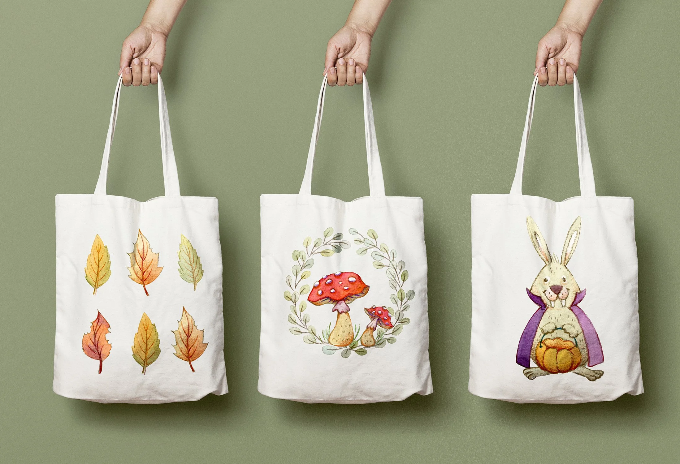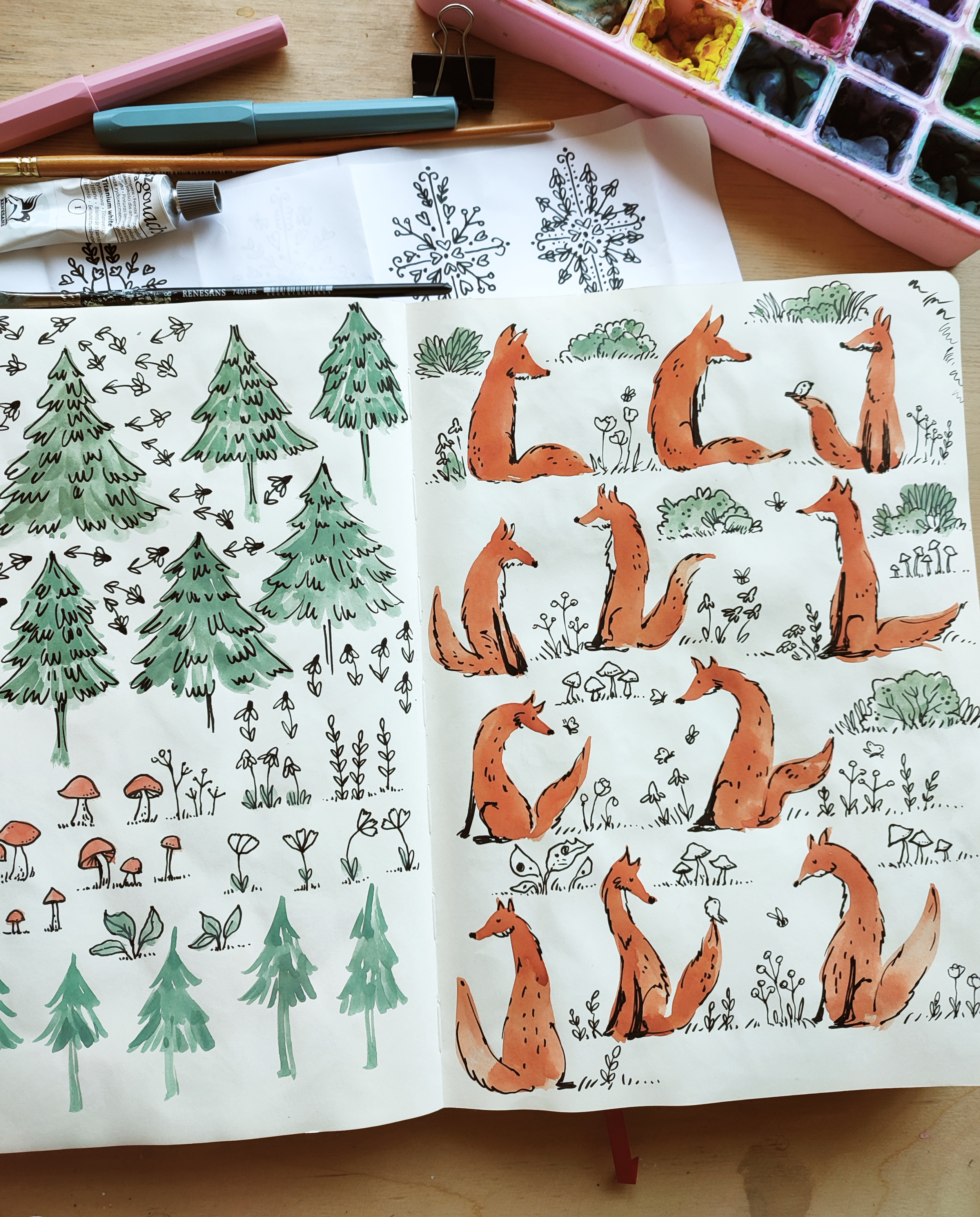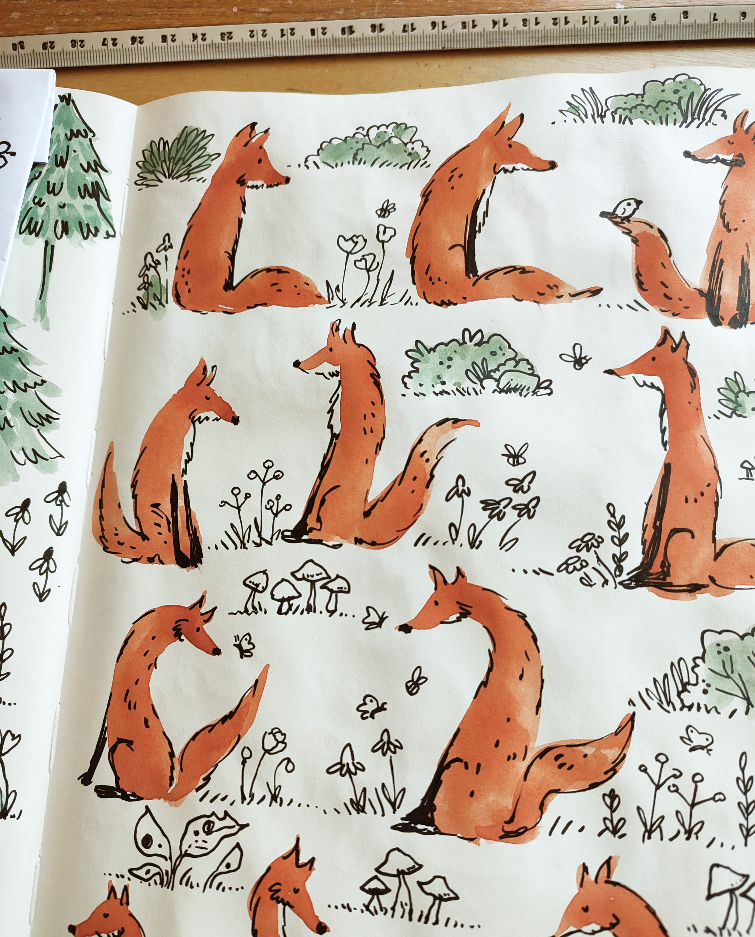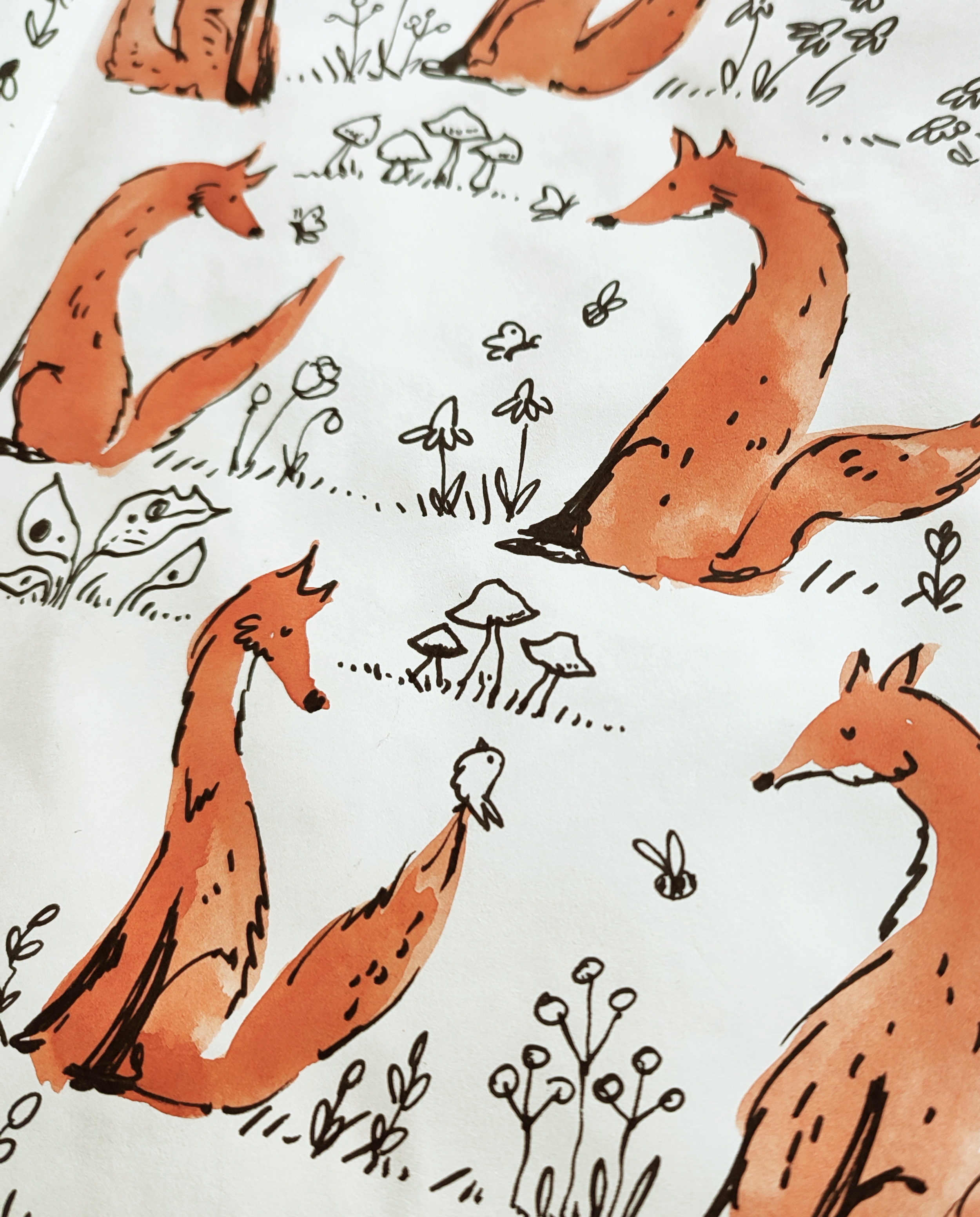 From there, the rest unfolded very naturally: a quiet forest setting, charming toadstools, and a palette built around sage green and rustic orange. Everything, as always, is entirely hand painted and hand drawn. That is one thing I never compromise on, no shortcuts, no digital brushes replacing real texture, just traditional techniques and real materials.