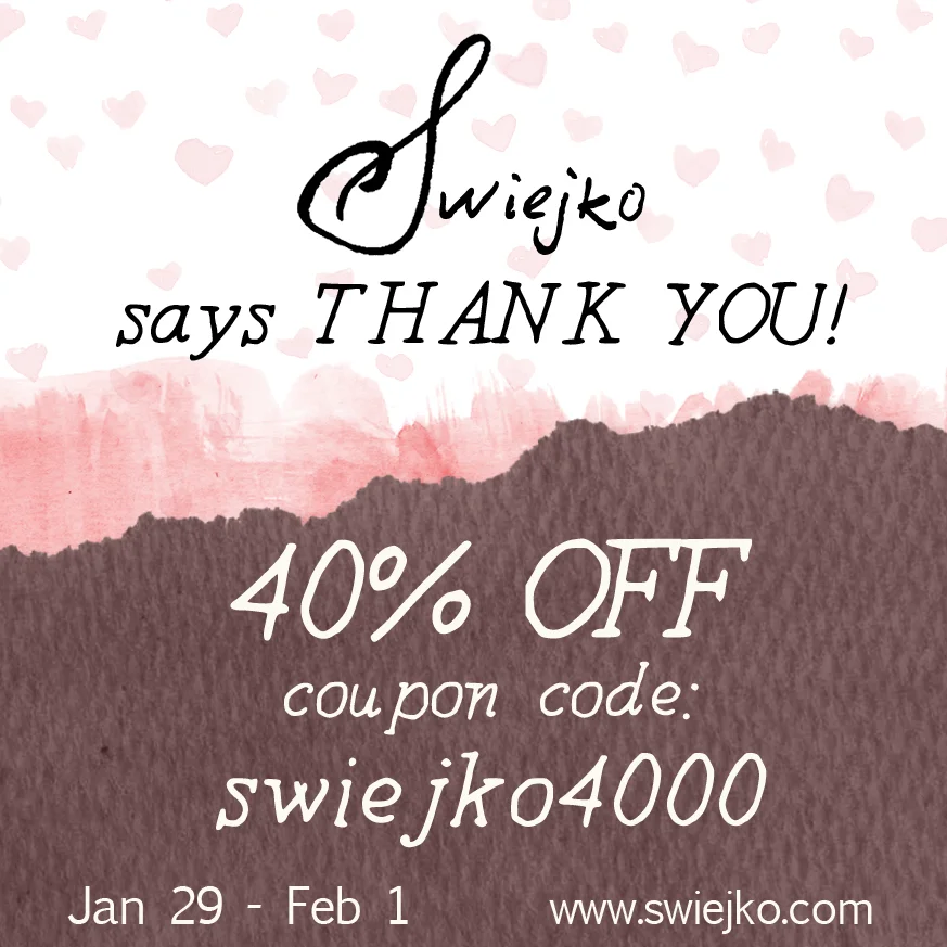 Z tej okazji przygotowałam promocję. Wystarczy wpisać kod "swiejko4000" przy dokonywaniu zakupów w moim Etsowym sklepie i można w ten sposób zaoszczędzić aż 40% kwoty całych zakupów!! Promocja trwa do północy w niedzielę. Mam nadzieję, że pomysł Wam się spodoba!