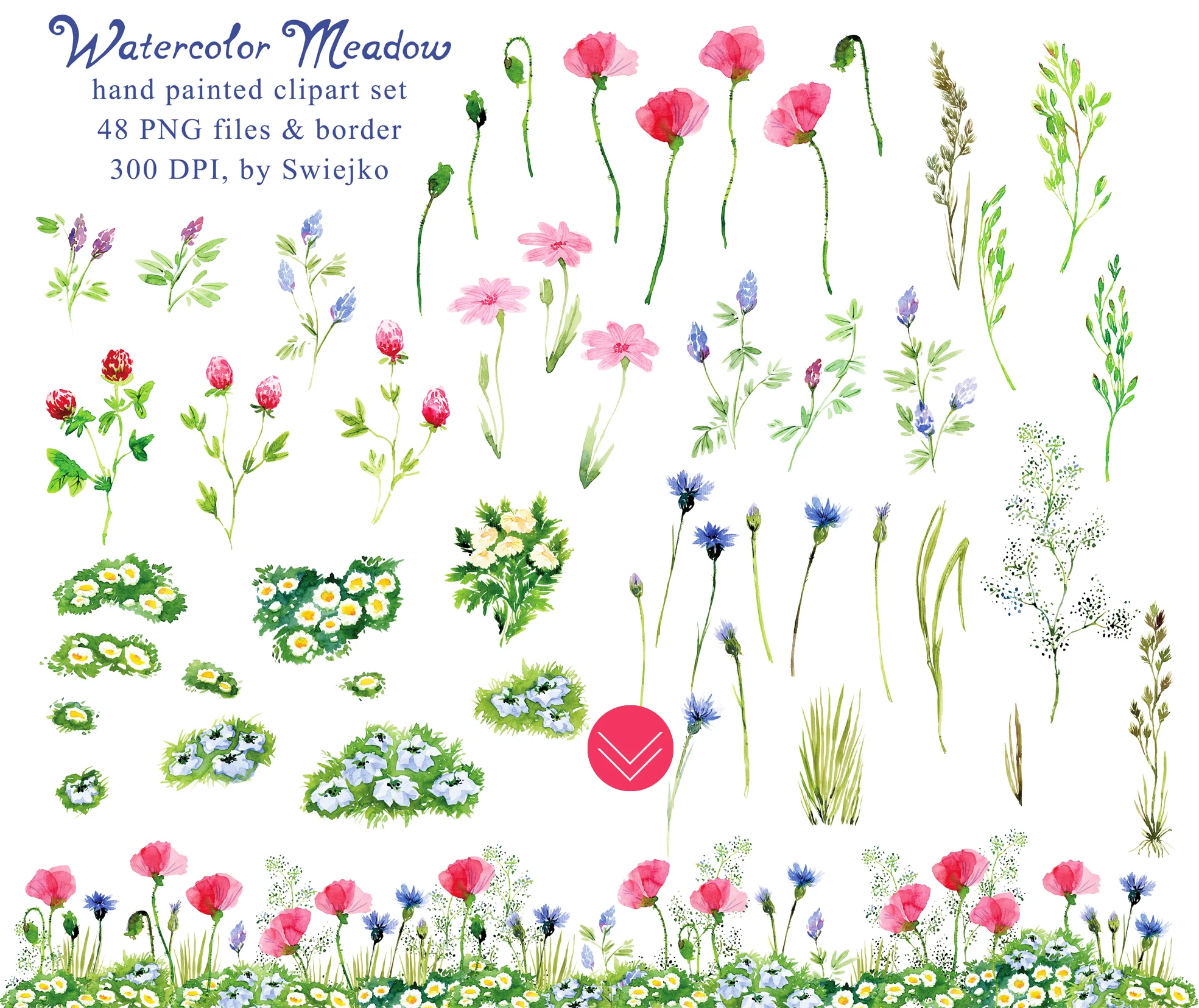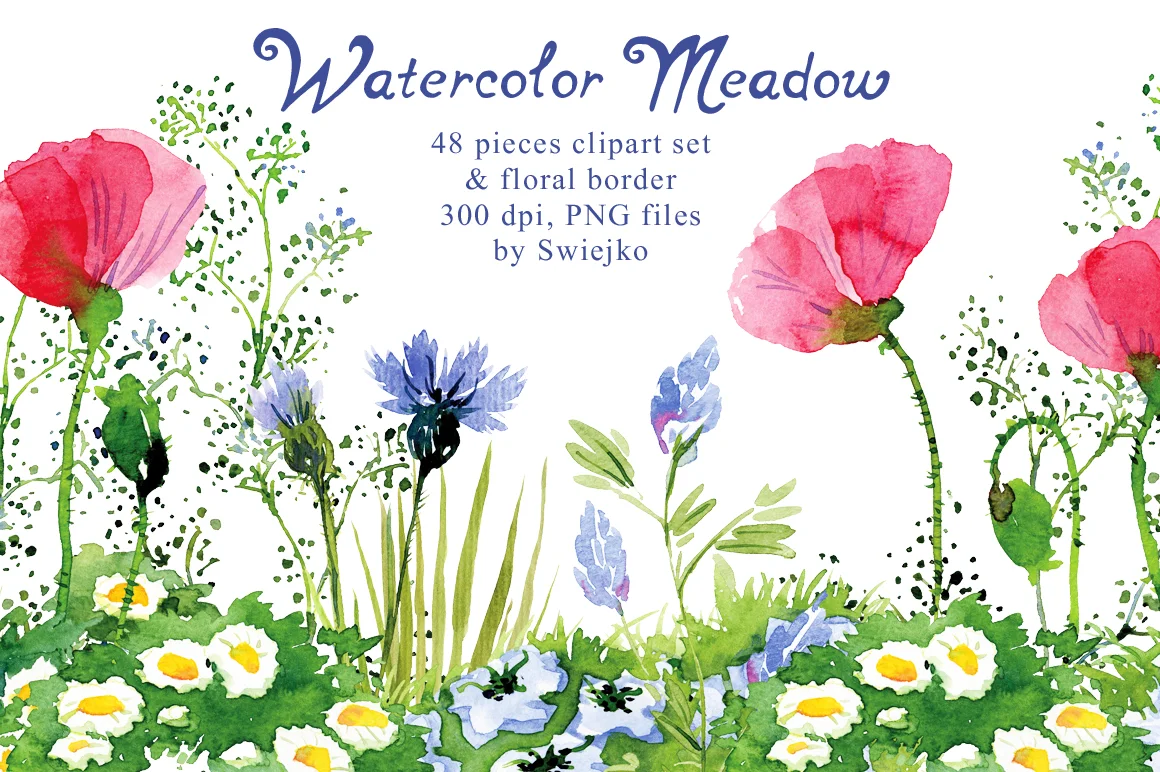Just in minutes I finished my newest watercolor clipart set. It's about meadow, what is obvious when you look at it. Meadow is my never ending inspiration. Planning my new garden (when, oh when it will come to realization!?) I dream about even a tiny piece of meadow flowerbed.