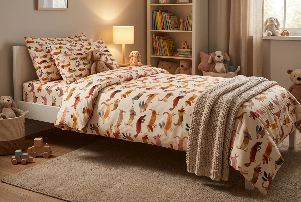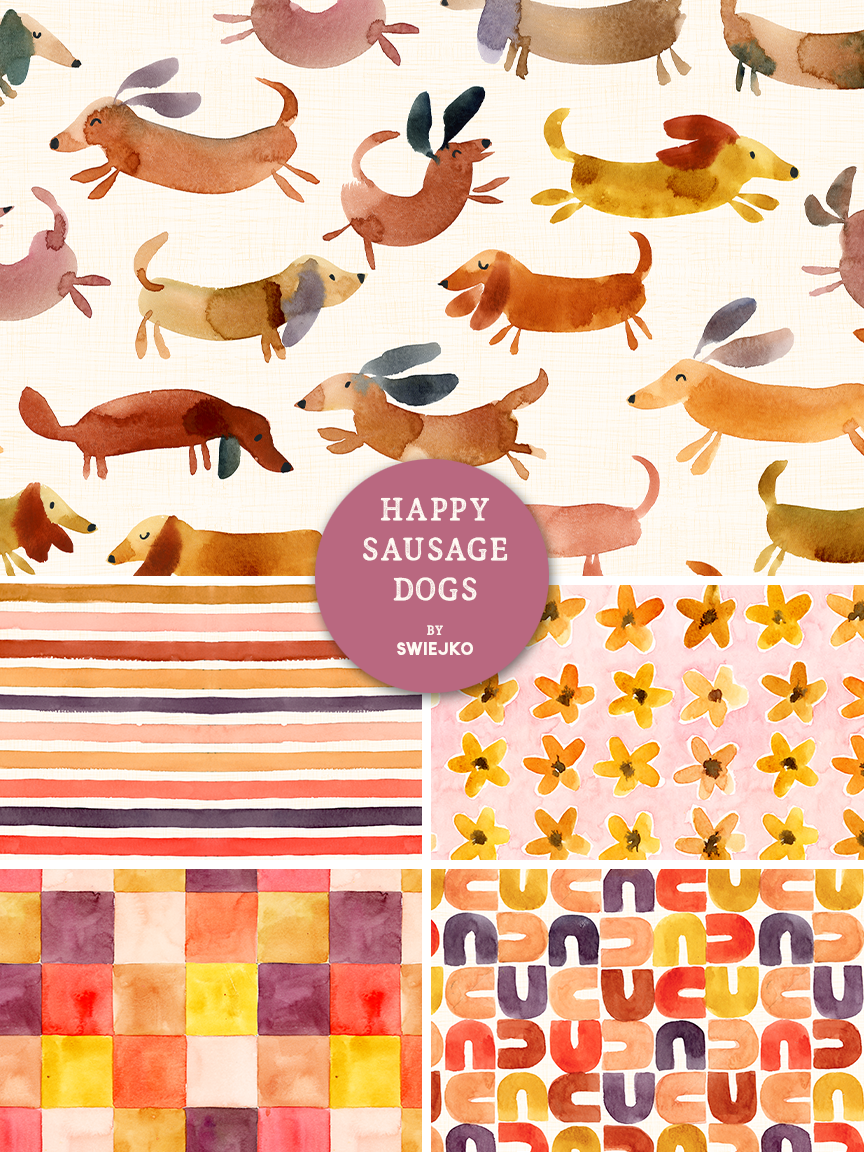 The collection is anchored by the main dachshund pattern and supported by four coordinating designs that allow for versatile mix and match applications: