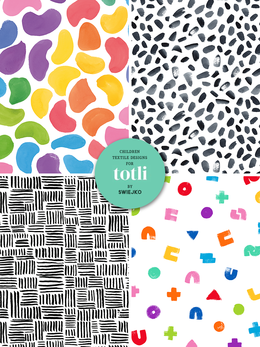 This collection features four bespoke textile designs developed for Totli, an Australian brand specializing in Montessori inspired play essentials for infants and toddlers. The primary objective was to create visually stimulating fabrics that support the earliest stages of child development, specifically focusing on sensory engagement and visual tracking for newborns and infants